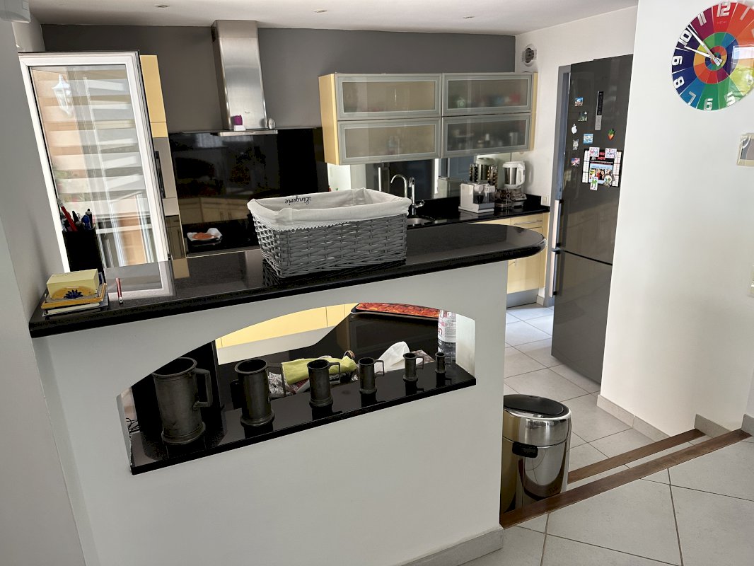 Elle se compose: d'un parking un garage, d'un rez-de-chaussée un cellier, un coin rangement, cuisine aménagée donnant sur le jardin et une piscine, ouverte sur salle à manger et salon (cheminée moderne) donnant sur une terrasse.