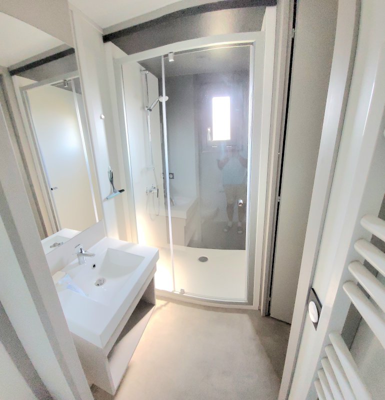 Il possède 3 pièces, un îlot central avec 2 chambres indépendantes avec accès direct sur la terrasse, avec chacune d’entre elle une salle d’eau équipée d’une douche et d’un WC.