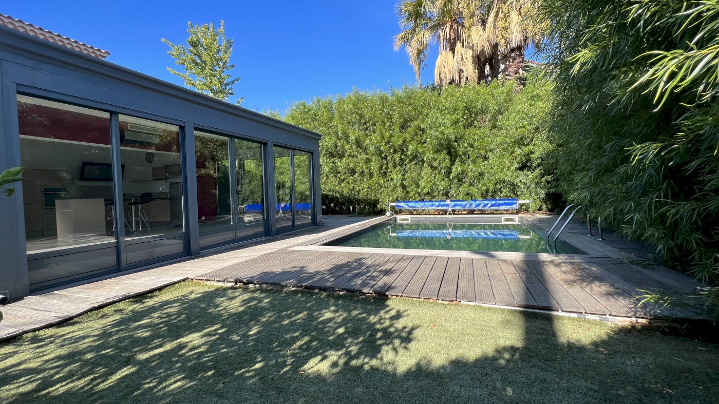 La maison est baignée de lumière naturelle tout au long de la journée, grâce à ses grandes baies vitrées coulissantes et à sa disposition intelligente. Vous pourrez également profiter d'un jardin avec terrasse et piscine.