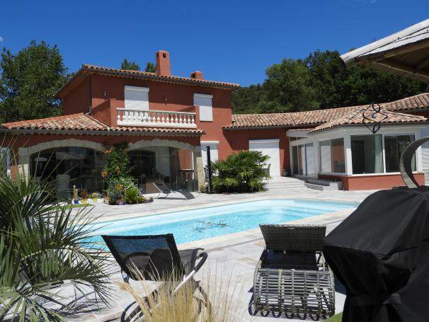 Cause santé, vendons, fort à regret, sur les hauteurs du charmant village perché, MOISSAC BELLEVUE (entre AUPS et REGUSSE), notre lumineuse villa atypique de 285 m² habitable sur env. 2040 m² cloturé, arboré (cypres, palmiers, oliviers dont un tricentenaire), piscine 8 x 4 m x 1,60 m chauffable et couverte (abri télesc.), électrolyseur de sel et régulateur de PH dans local technique, gazebo en bambou de Bali 8 pers., espaces fitness (carrelage façon parquet et murs en pierre naturelle), spa 5 personnes.