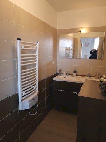 Salle de bain et WC indépendant. Chambre avec dressing. Carrelage imitation parquet. Dallage bois exotique sur la terrasse.