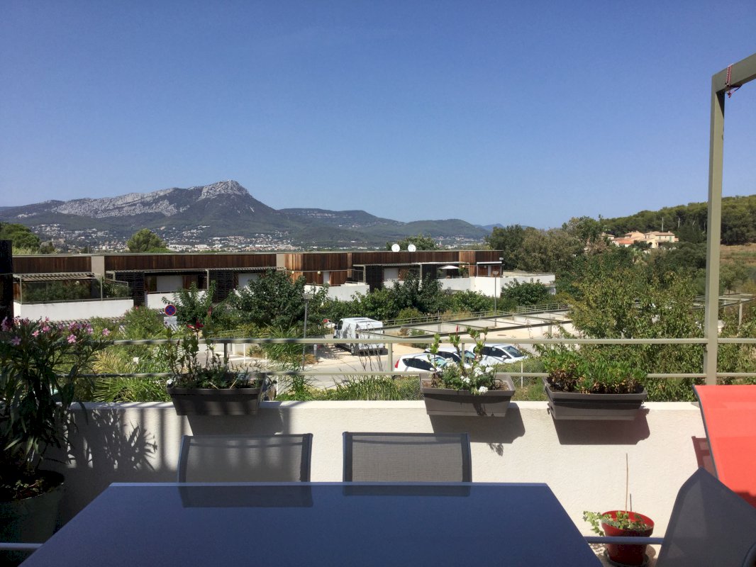 La piéce de vie dessert 2 espaces extérieurs : une terrasse de 27 m² avec vue sur le coudon et un balcon couvert de 8 m². Les 2 chambres ont une superficie voisine de 11,50 m². La cuisine équipée et la climatisation sont neuves.