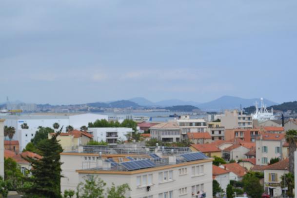 Un balcon accessible de la cuisine avec coin machine à laver le linge et séche linge (Vue sur le fort de six-Fours).