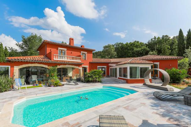 Cause santé, vendons, fort à regret, sur les hauteurs du charmant village perché, MOISSAC BELLEVUE (entre AUPS et REGUSSE), notre lumineuse villa atypique de 285 m² habitable sur env. 2040 m² cloturé, arboré (cypres, palmiers, oliviers dont un tricentenaire), piscine 8 x 4 m x 1,60 m chauffable et couverte (abri télesc.), électrolyseur de sel et régulateur de PH dans local technique, gazebo en bambou de Bali 8 pers., espaces fitness (carrelage façon parquet et murs en pierre naturelle), spa 5 personnes.