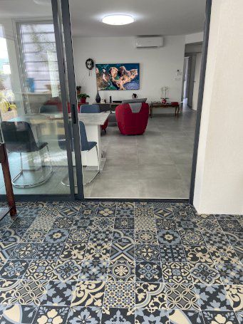 Un espace de 20 m2 a été crée en fermant une terrasse avec des baies coulissantes, ce qui fait une surface habitable d’environ 100 m2 .