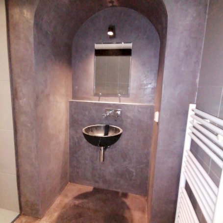La salle d'eau possède une douche à l'italienne XXL ( receveur en résine neuf ) , une vasque en marbre et un radiateur sèche serviettes.