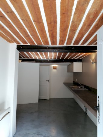 L'entrée se fait par la cuisine .Plan de travail suspendu de 5 m de long , en béton ciré , sous lequel vous pouvez installer tout votre électro ménager.Espace repas possible également.