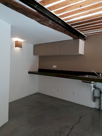 L'entrée se fait par la cuisine .Plan de travail suspendu de 5 m de long , en béton ciré , sous lequel vous pouvez installer tout votre électro ménager.Espace repas possible également.